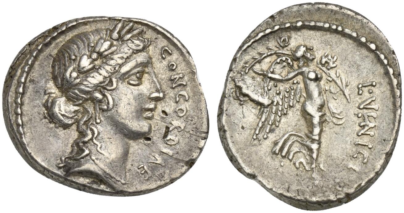 | ObverseInscription or printing placed on the obverse.: | CONCORDIAE (Latin).Laureate head of Concordia r. |