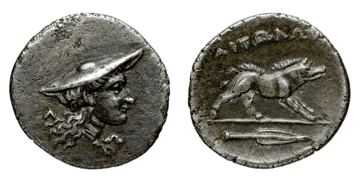 | ReverseInscription or printing placed on the reverse.: | AΙΤΩΛΩΝ (Greek).Boar standing left or right. In the field or at the exergue, spear head. |