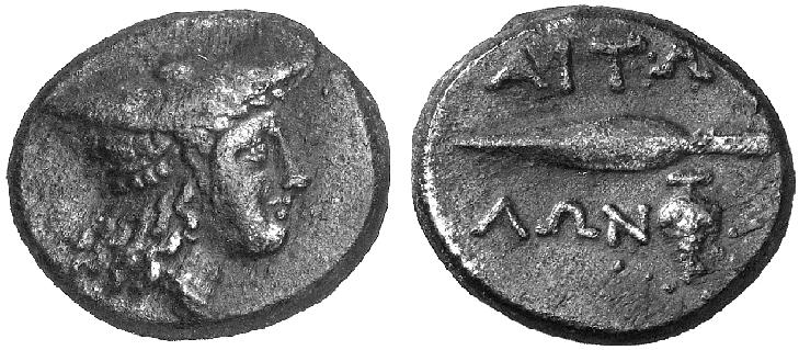 | ReverseInscription or printing placed on the reverse.: | AΙΤΩΛΩΝ (Greek).Spear head. In the field, a bunch of grapes. |