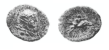 | ReverseInscription or printing placed on the reverse.: | (IACEWΝ) (Greek).Male charakter holding a dolphin swimming right. |