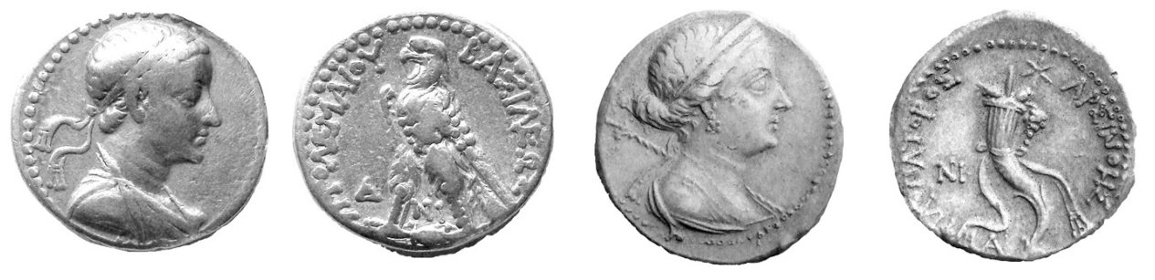 | ObverseInscription or printing placed on the obverse.: | Different types: 1)Draped and diademed bust of Ptolemy V right, 2) Head of Arsinoe III to right, wearing stephane, tip of a lotos-tipped scepter visible behind her left shoulder |