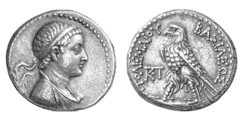 | ReverseInscription or printing placed on the reverse.: | ΠΤΟΛΕΜΑΙΟΥ ΒΑΣΙΛΕΩΣ (Greek).Eagle standing to left on thunderbolt. In field, monogram. Border of dots. |