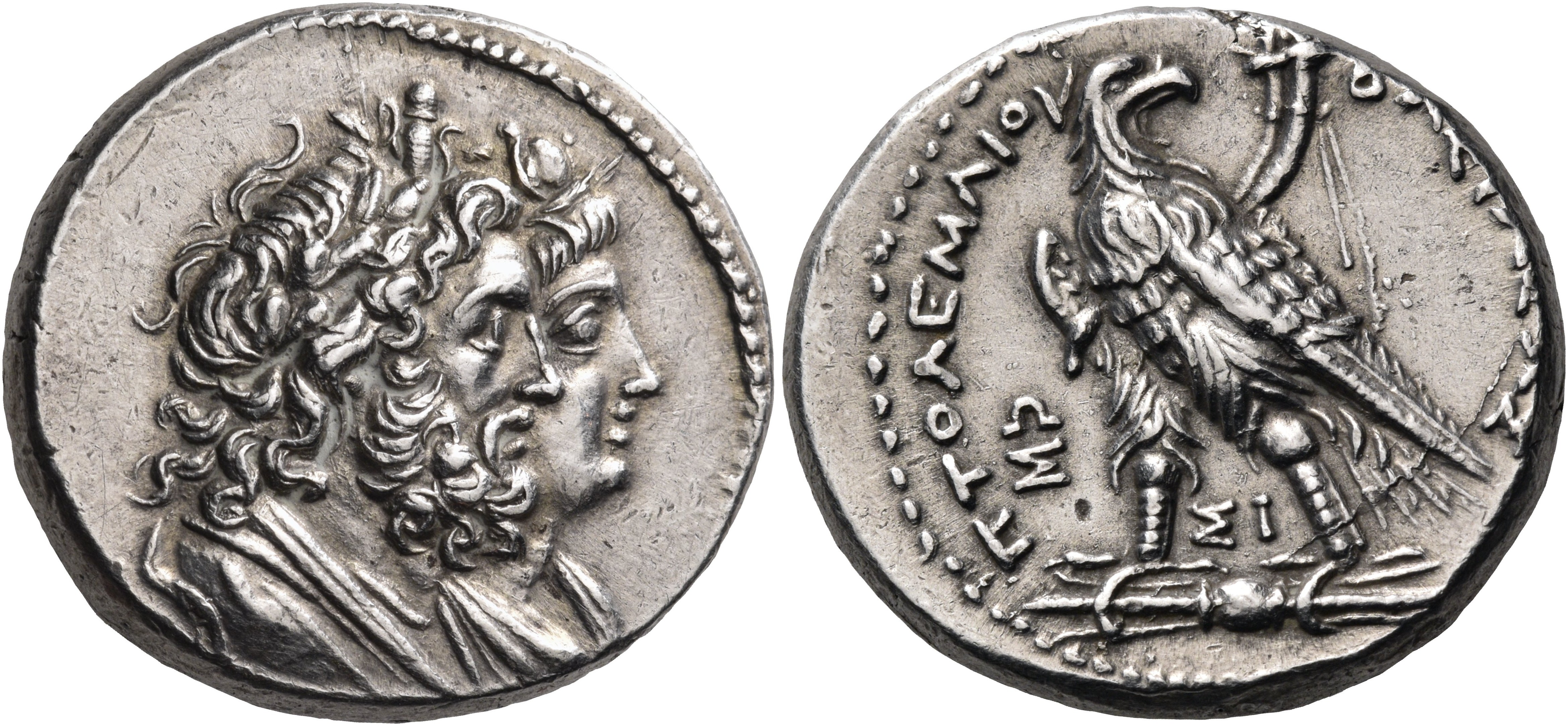 | ReverseInscription or printing placed on the reverse.: | ΠTOΛEMAIOY BAΣIΛEΩΣ (Greek).Eagle with closed wings standing on thunderbolt to left, his head turned back to right, with cornucopiae at his shoulder, in field to left, Ω/Σ, between legs, ΣΙ |