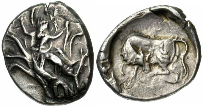 | ObverseInscription or printing placed on the obverse.: | Europa, nude to the waist, seated three quarters right in tree, resting head on left hand | ReverseInscription or printing placed on the reverse.: | Bull left, head reverted. |