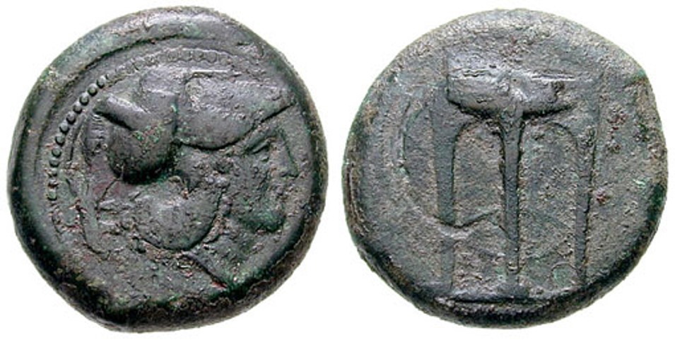 | ObverseInscription or printing placed on the obverse.: | Head of Athena right, wearing a crested Corinthian helmet. Border of dots. | ReverseInscription or printing placed on the reverse.: | Tripod. |