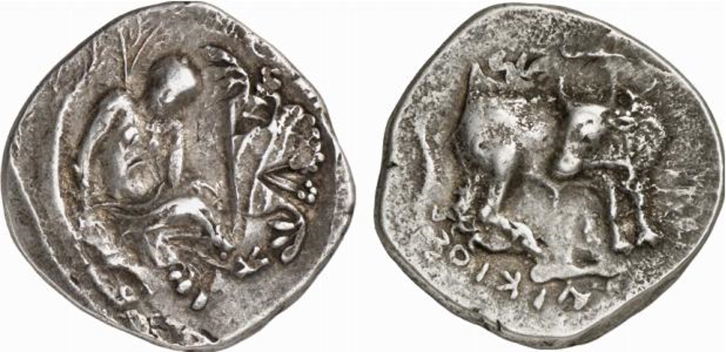 | ObverseInscription or printing placed on the obverse.: | (Greek) Europa, nude to the waist, seated three quarters right in tree, resting head on left hand | ReverseInscription or printing placed on the reverse.: | Bull right, head reverted. |