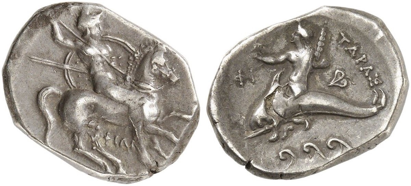 TAPAΣ (Greek) Male character (Taras or Phalanthos), nude, seated on a dolphin to left, holding distaff, over waves. In left field, ΦΙ. In right field, ivy-leaf.