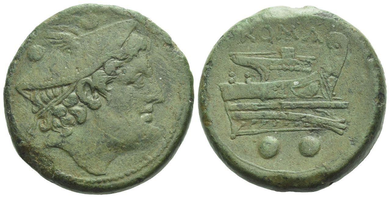 | ObverseInscription or printing placed on the obverse.: | Head of Mercury right, above, two pellets | ReverseInscription or printing placed on the reverse.: | ROMA (Latin) Prow r., two pellets below |