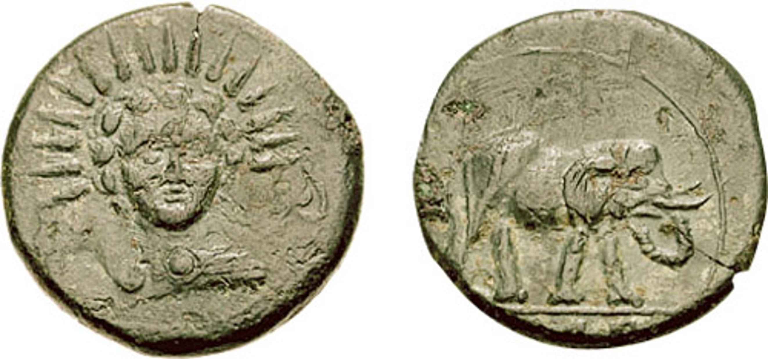 | ObverseInscription or printing placed on the obverse.: | Radiate facing bust of Sol, star to left | ReverseInscription or printing placed on the reverse.: | Elephant standing right |