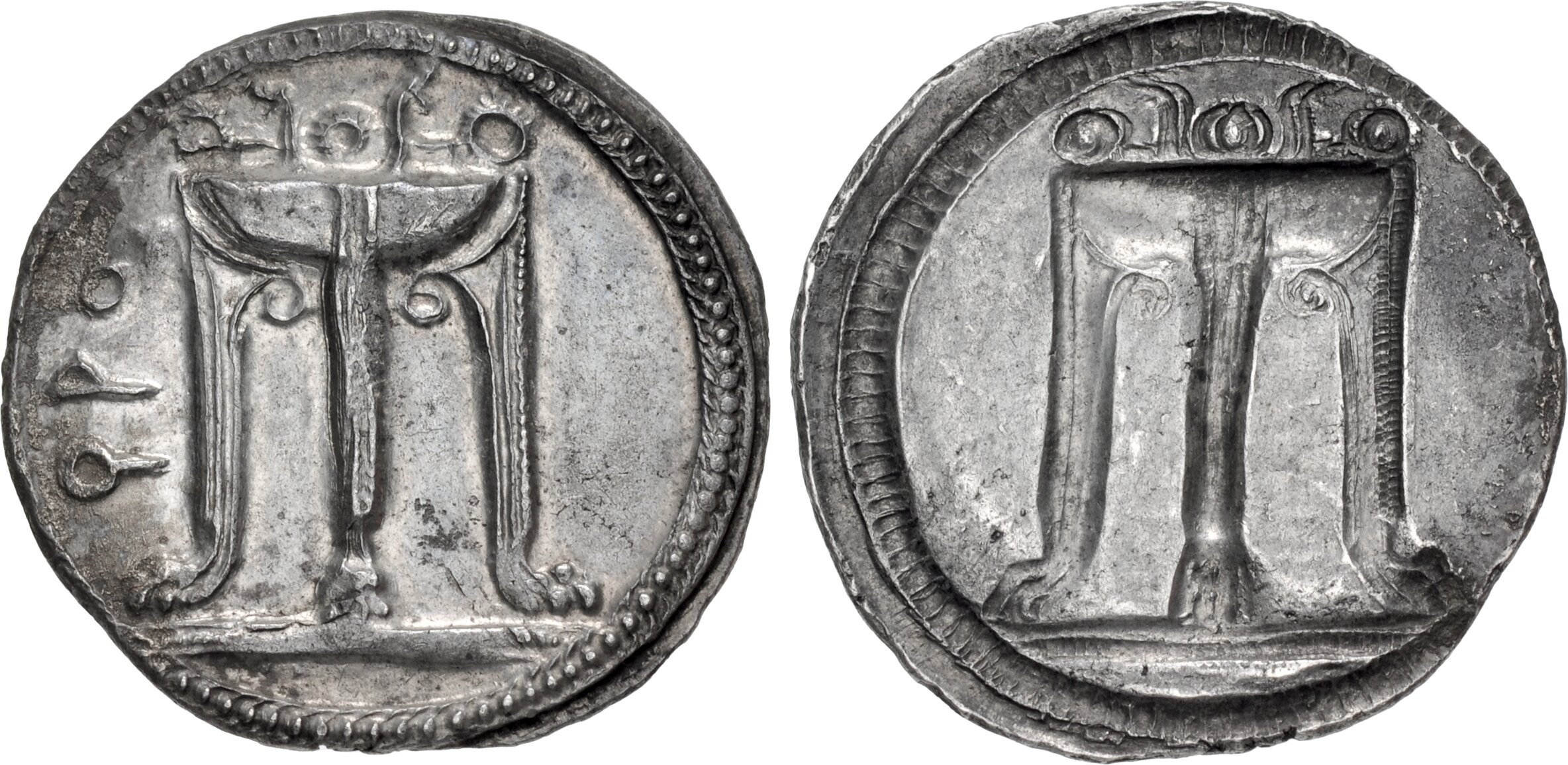 Incuse tripod as obverse, but wreaths and serpents in relief