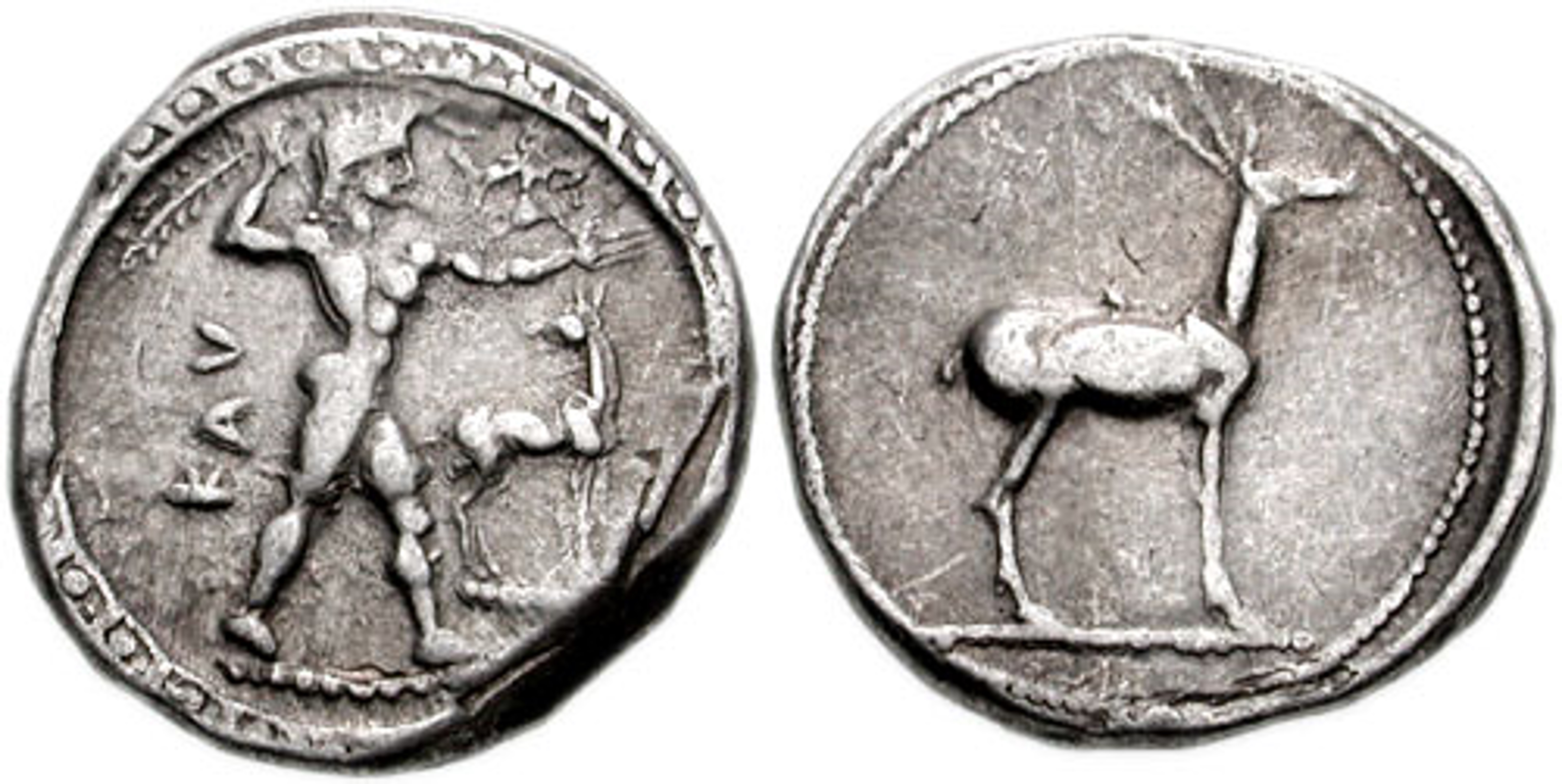 ΚΑV (Greek) Apollo advancing right, naked, brandishing laurel branch with right hand, a small daimon running on outstretched left arm. In right field, stag standing right. Decorated border.