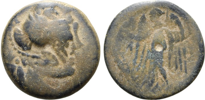 | ObverseInscription or printing placed on the obverse.: | Head of Zeus right, wearing laurel wreath. | ReverseInscription or printing placed on the reverse.: | ΒΑΣΙΛΕΩΣ ΠΤΟΛΕΜΑΙΟΥ (Greek) Eagle standing left on thunderbolt |