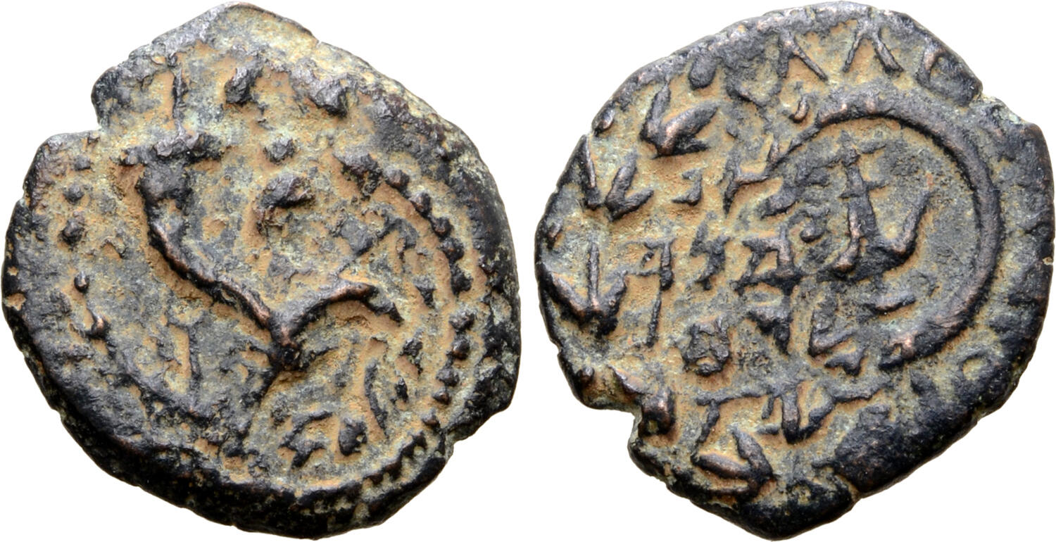 24581 - Jerusalem (Alexander Jannaeus) (AE double cornucopia/legend) over Alexander Jannaeus (anchor/lily flower) (Roma Numismatics, EA 83, May 2021, 422)
