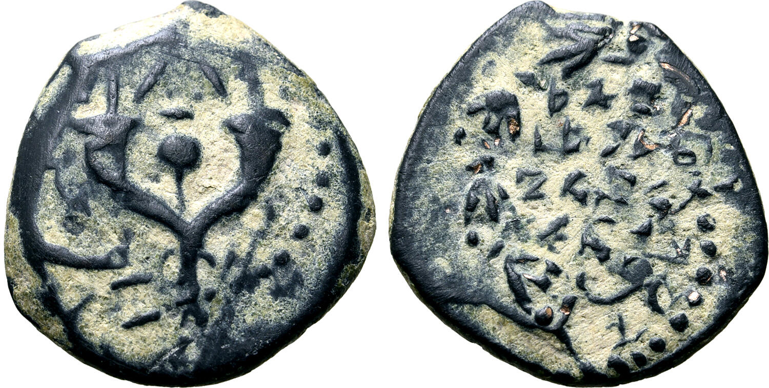 "YNTN HKHN HGDLWḤBR HYHWDYM": transcription from paleo-Hebrew script ; ie. "Yonatan the High Priest and the Council of the Jews" (Hebrew) Legend within wreath.