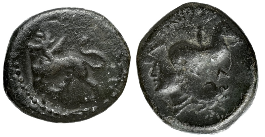 | ObverseInscription or printing placed on the obverse.: | Chimera left. | ReverseInscription or printing placed on the reverse.: | Head of Athena left, wearing Corinthian helmet. |