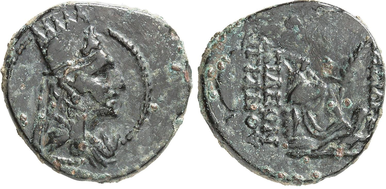 BAΣIΛEΩΣ BAΣIΛEΩN TIΓPANOY Tyche of Antioch seated on rocks right, wearing turreted crown, holding palm branch. At her feet, the upper portion of the river-god Orontes swimming right. In field, letters/monograms. Border of dots.