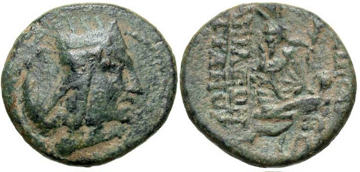 BAΣIΛEΩΣ BAΣIΛEΩN TIΓPANOY Tyche of Antioch seated on rocks right, wearing turreted crown, holding palm branch. At her feet, the upper portion of the river-god Orontes swimming right. In field, letters/monograms. Border of dots.