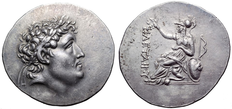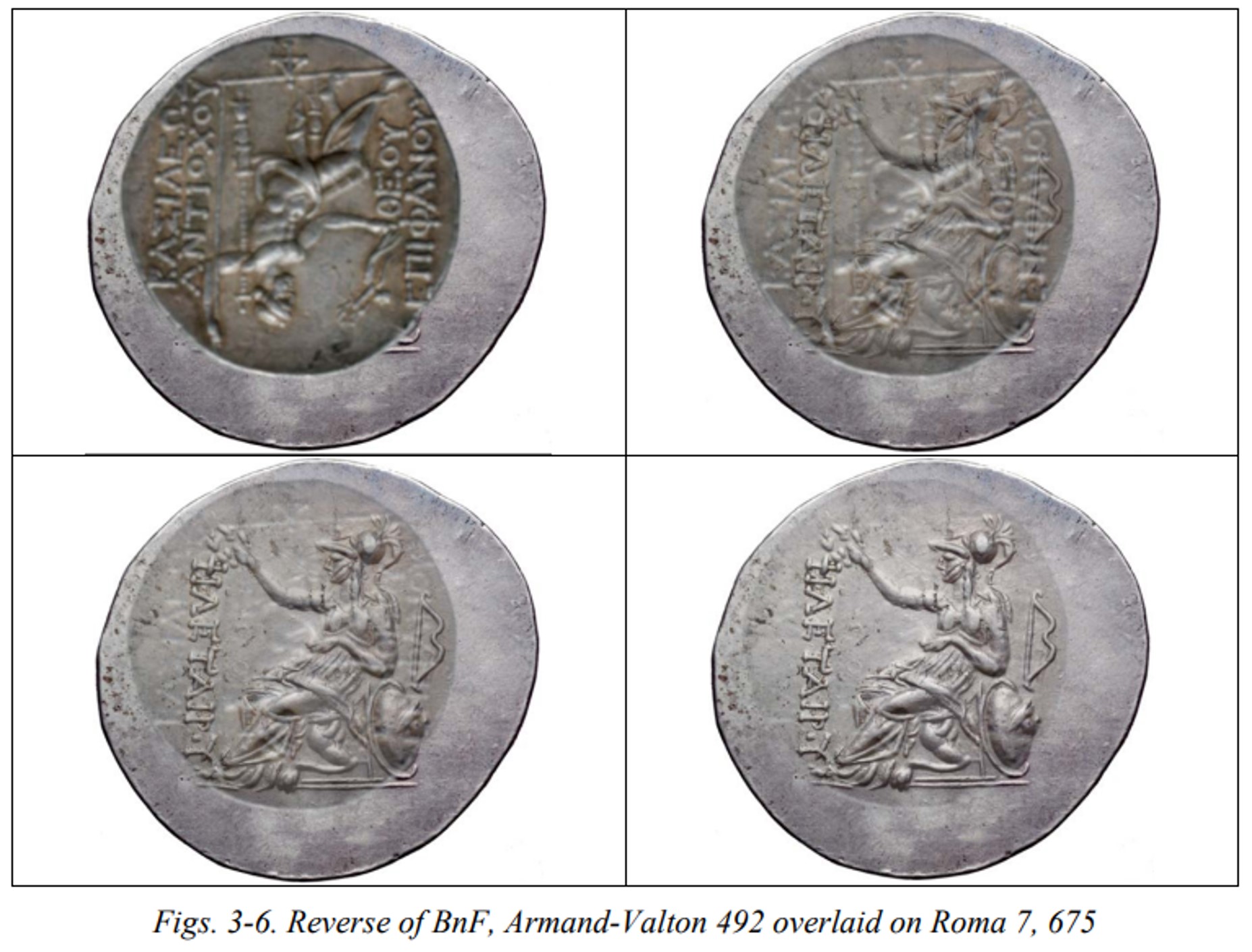 "Interestingly, this coin is overstruck on a tetradrachm of Antiochos IV 175-164 with seated Zeus reverse (cf. SC 1396-1397 dated 173/2-169/8 BC circa or SC 1398-1400 dated 168-164 BC); the following traces of the undertype are visible on the reverse: letters TH-E-O-Y on Athena's shoulder; folders of Zeus' himation on Athena's face; and leg of Zeus' throne on Athena's right arm."