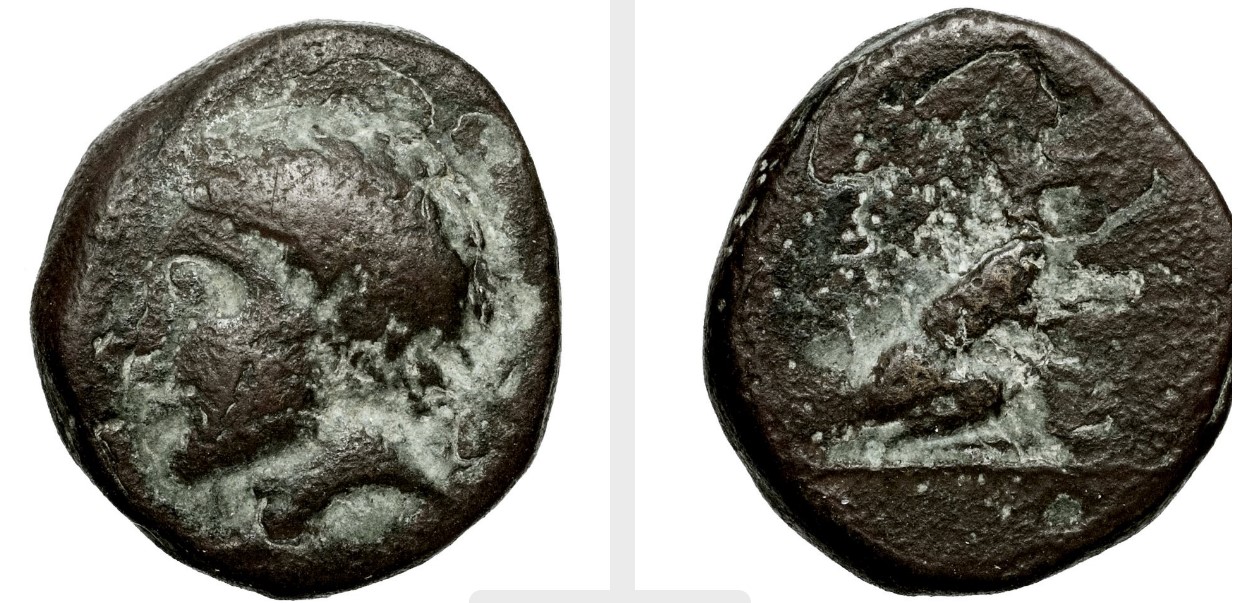 | ObverseInscription or printing placed on the obverse.: | Male head (Dioscur?) left. | ReverseInscription or printing placed on the reverse.: | Dog seated right. |