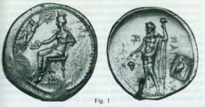 Aphrodite seated left, holding patera over altar. In left field, Nike flying right. Border of dots.