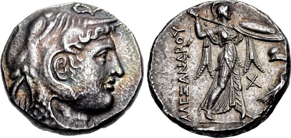 ΑΛΕΞΑΝΔΡΟΥ (Greek) Athena Alkidemos advancing to right, brandishing spear with her right hand and with a shield on her left arm. In the right field, Corinthian helmet, below monogram (AX) and eagle on thunderbolt. Border of dots.