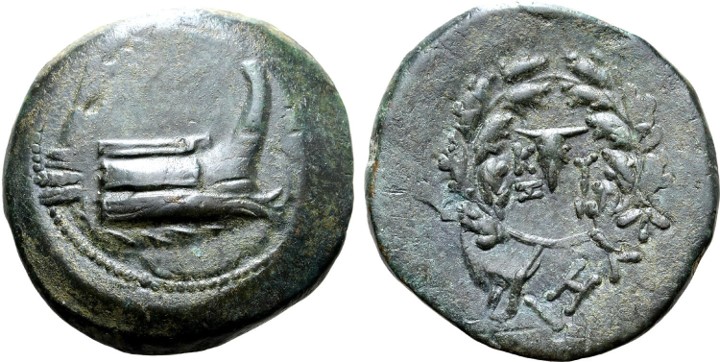 | ObverseInscription or printing placed on the obverse.: | Prow to right | ReverseInscription or printing placed on the reverse.: | K-Y Z-I (Greek) Bucranium in oak wreath |