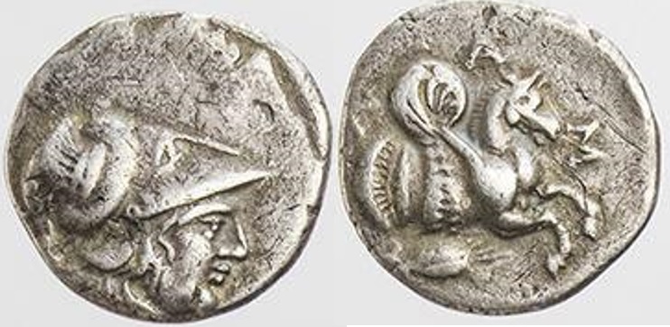 | ObverseInscription or printing placed on the obverse.: | Head of Athena right, wearing a crested Corinthian helmet | ReverseInscription or printing placed on the reverse.: | ΛΑΜ (Greek) Forepart of Pegasos right. Below, grain ear |