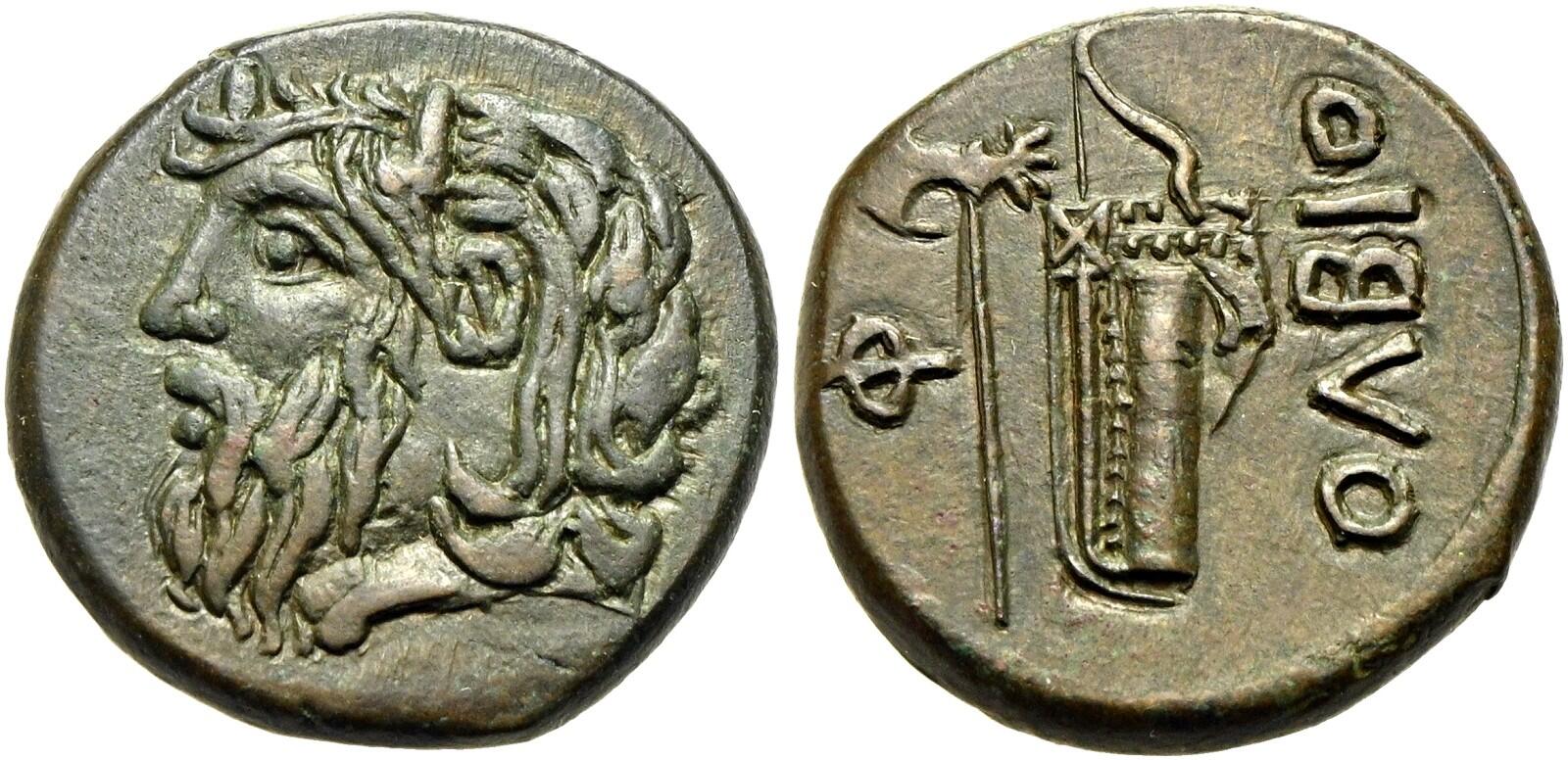 ObverseInscription or printing placed on the obverse.: Horned head of the river-god Borysthenes to left ReverseInscription or printing placed on the reverse.: OΛBIO (Greek) Axe and bow in bow-case