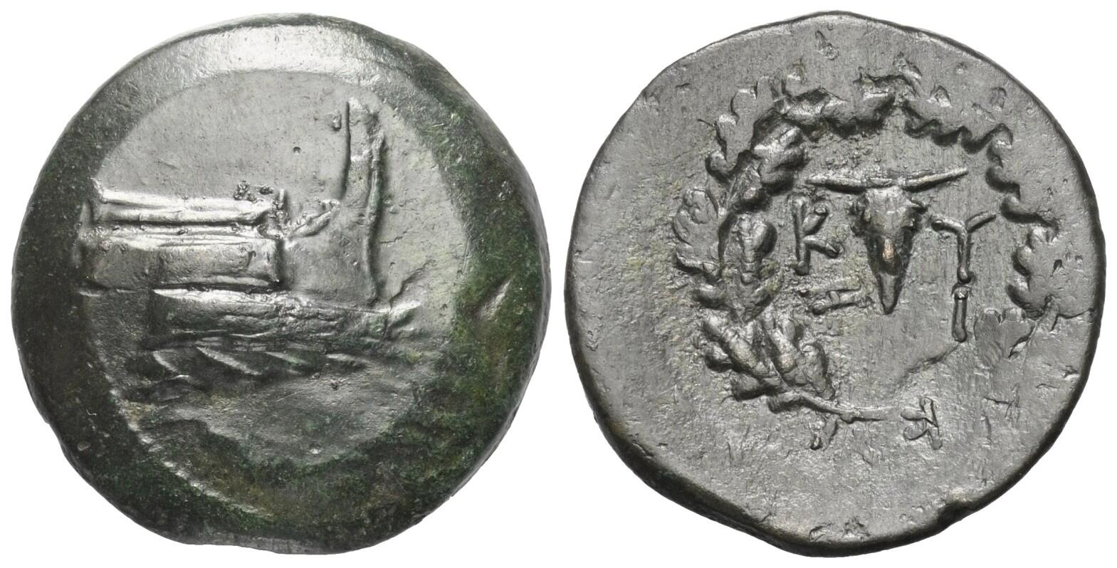 | ObverseInscription or printing placed on the obverse.: | Prow to right | ReverseInscription or printing placed on the reverse.: | K-Y Z-I (Greek) Bucranium in oak wreath |