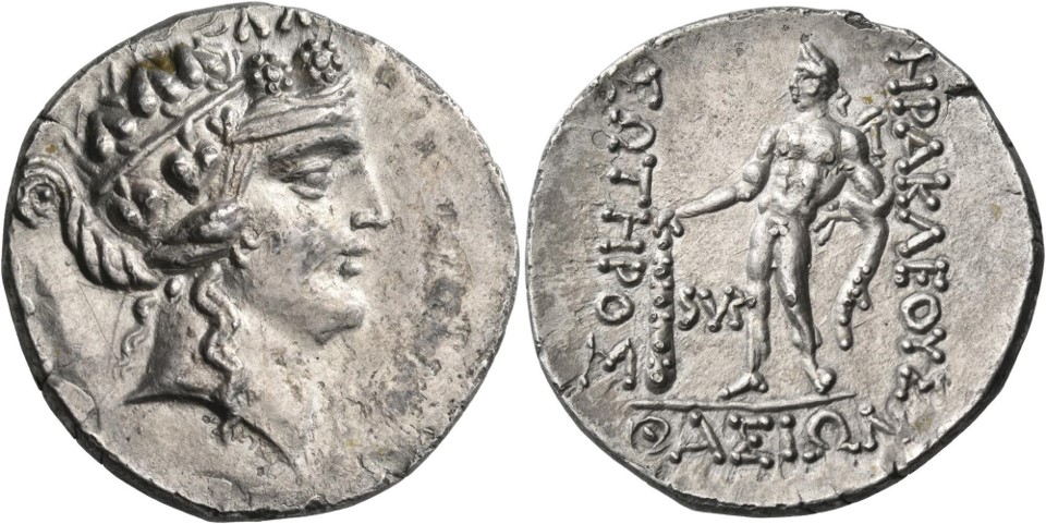 1320 - Thasos (tetradrachm Dionysus/Heracles) over Aesillas (Alexander/fiscus, club and sella) (Nomos, 23, Nov. 2021, 57)