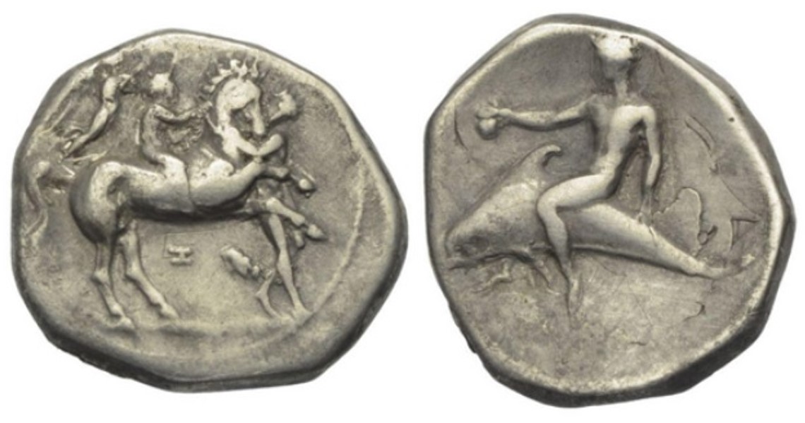 TAPAΣ (below) (Greek) Taras seated astride dolphin to left, holding a vase in his extended right hand, K to right