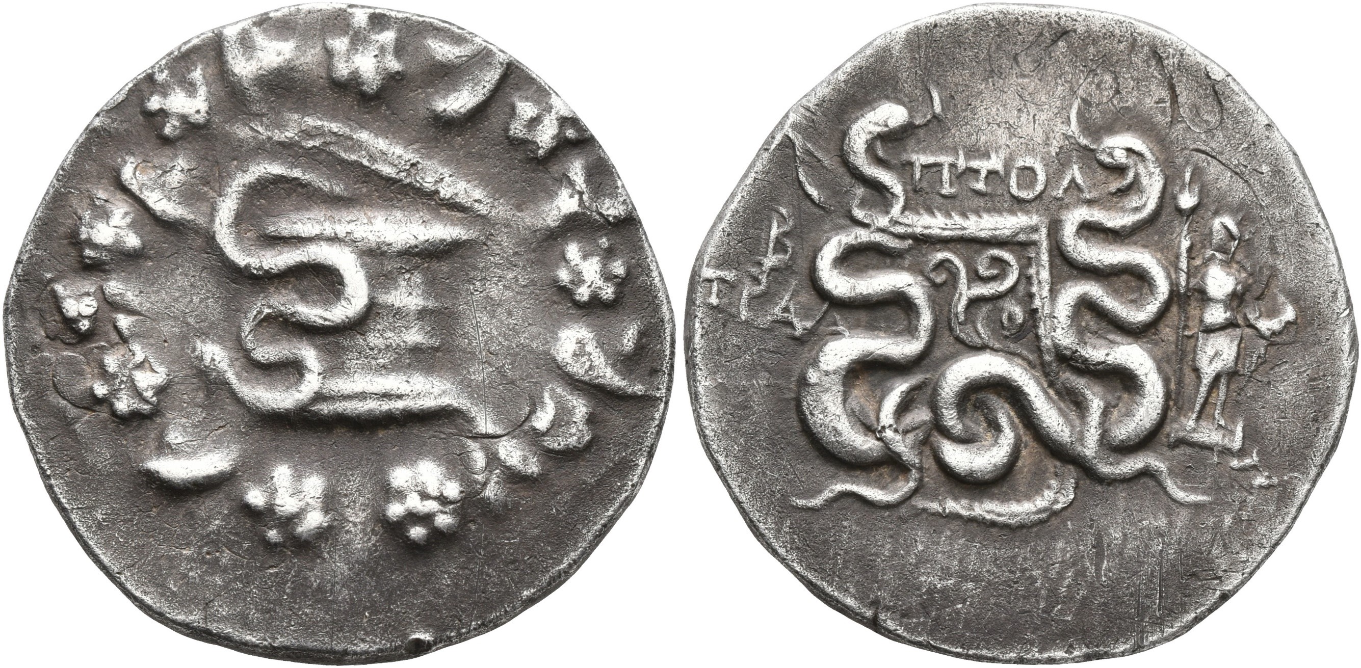 ObverseInscription or printing placed on the obverse.: Ciste mystica from which snake coils, around, ivy wreath with fruits ReverseInscription or printing placed on the reverse.: TPAΛ (Greek) Two snakes coiled around a bow case, above, ΠΤΟΛ, to left, B above TPAΛ, to right, Dionysos standing right, holding thyrsos in his right hand and mask of Silenos in his left