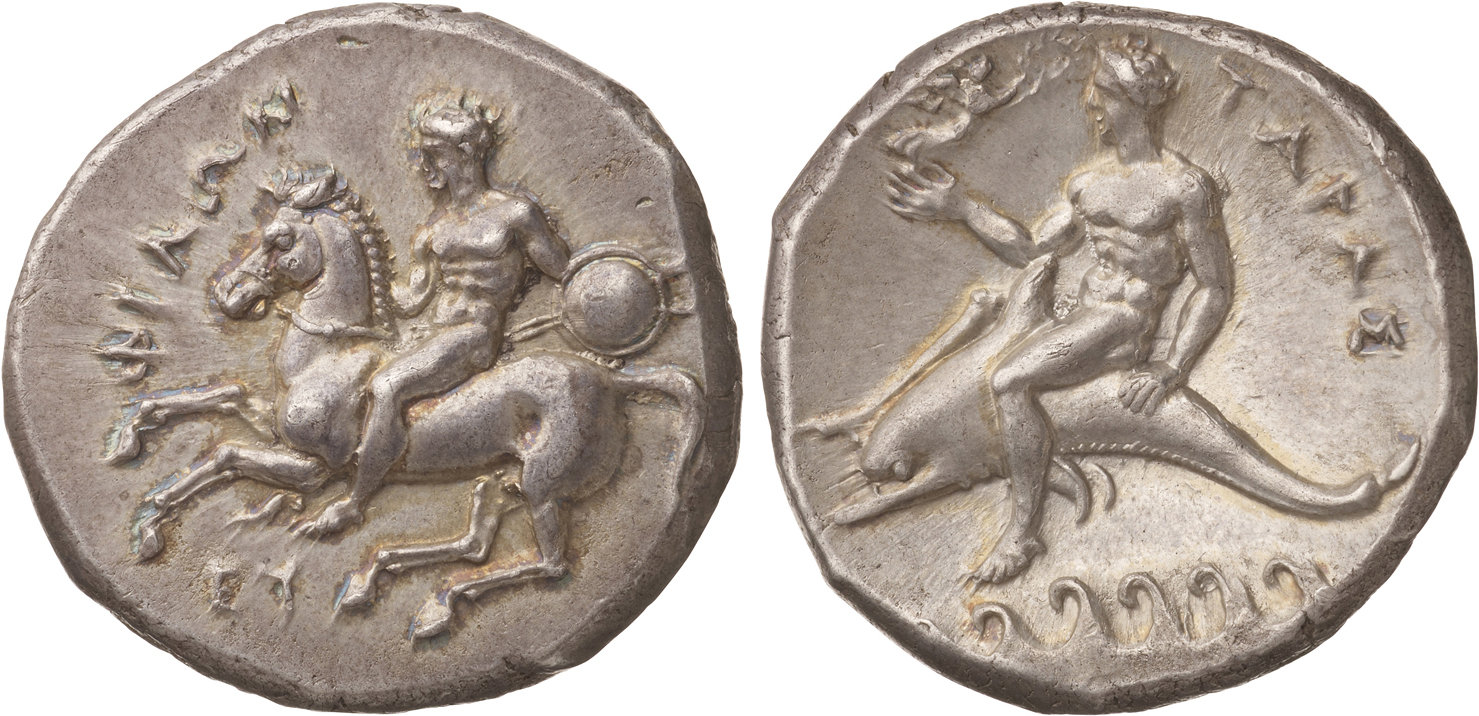 | MintIdentifies the place of manufacture or issue of a numismatic object. ᵖ: | Taras | Ancient regionAncient region. ᵖ | Calabria | Modern countryModern country: Italy | AuthorityIdentifies the authority in whose name (explicitly or implicitly) a numismatic object was issued. ᵖ: |